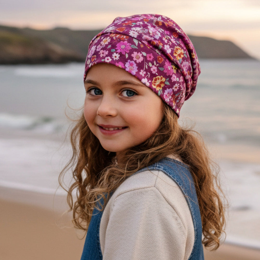 Wollhuhn Öko Long Beanie / Wendemütze, Ganzjährig, Zweilagig, Blumen Beere