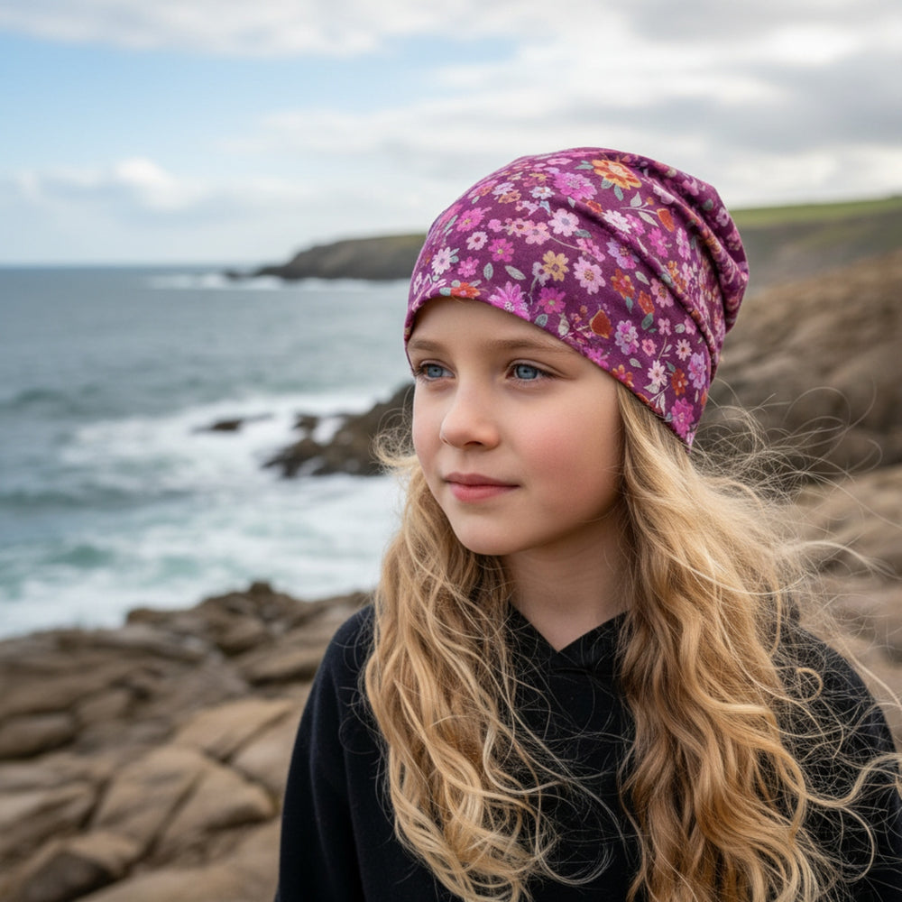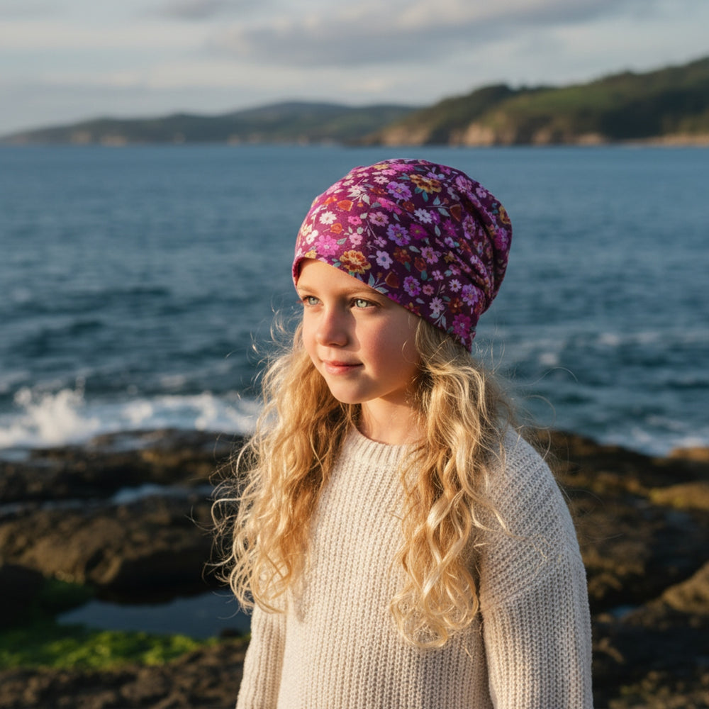 Wollhuhn Öko Shorties / Wendemütze, Ganzjährig, Zweilagig, Blumen Beere