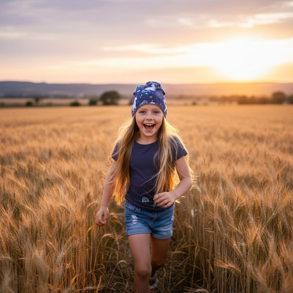Wollhuhn Öko Shorties / Wendemütze, Ganzjährig, Zweilagig, Einhörner Dunkelblau