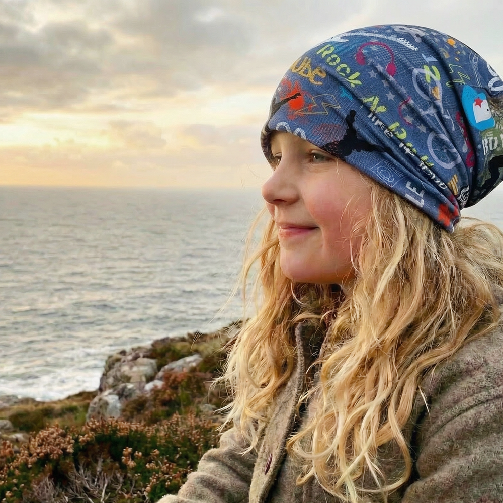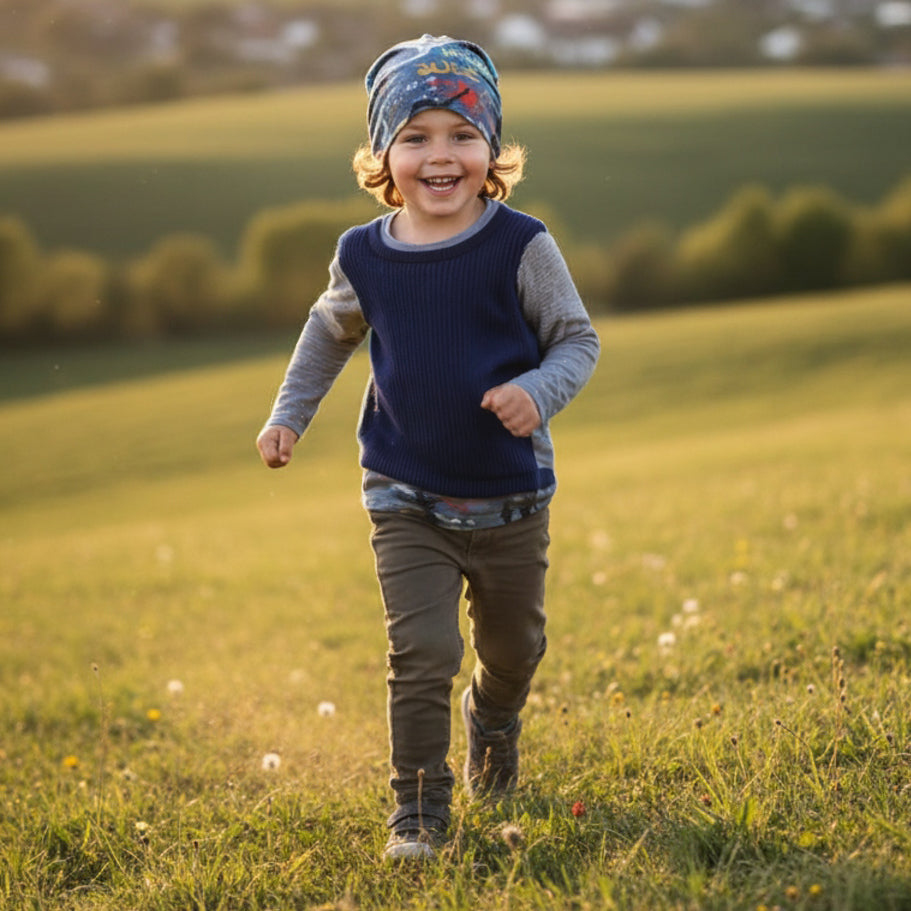 Unsere Long Beanies werden aus hochwertigem Öko-Jersey (95 % Baumwolle, 5 % Elasthan) genäht, kombiniert mit robustem Öko-Garn. Hautfreundlich, langlebig und nachhaltig – genau richtig für kleine und große Entdecker!