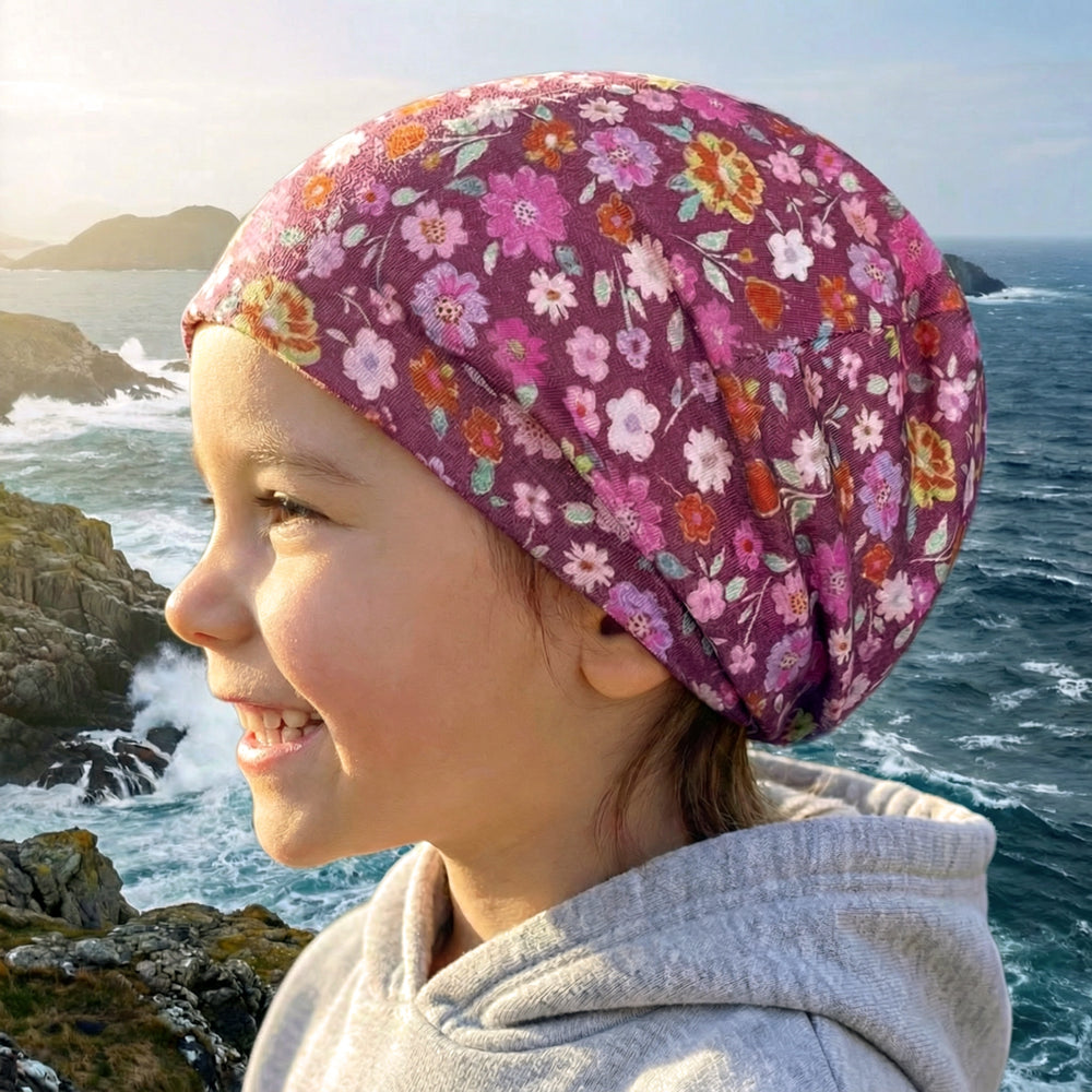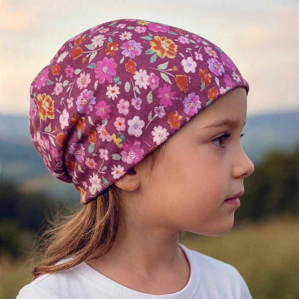 Wollhuhn Öko Shorties / Wendemütze, Ganzjährig, Zweilagig, Blumen Beere