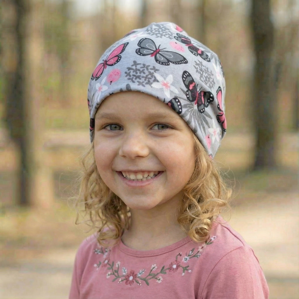 Wollhuhn Öko Shorties / Wendemütze, Ganzjährig, Zweilagig, Schmetterlinge Grau/Rosa
